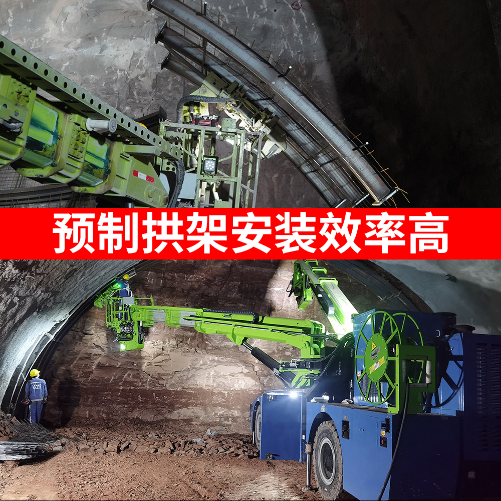 安 全 省 时:中臂最大举升力3吨,遥控操作,结合多榀预制和折叠拱架安装,